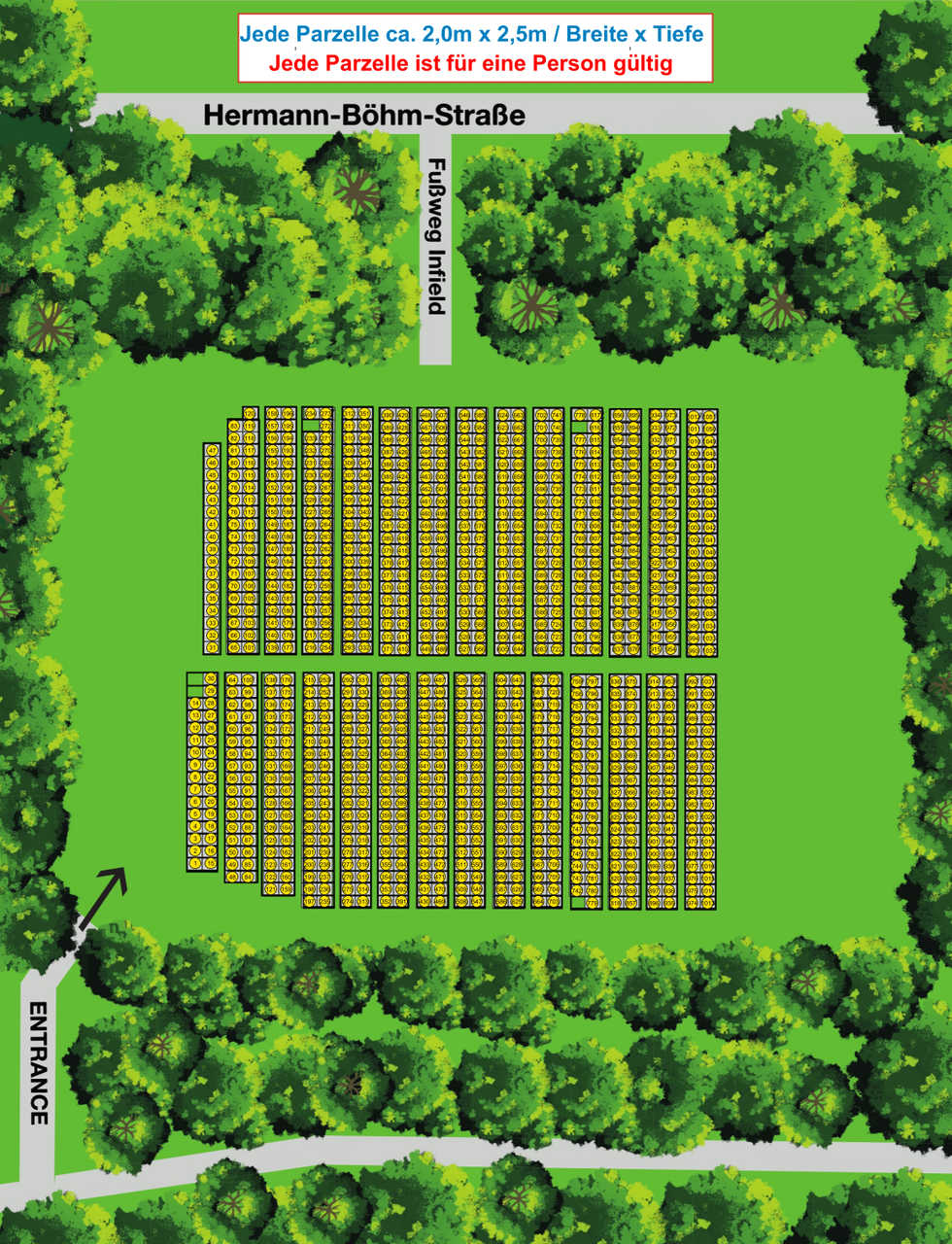 Each guest has a reserved space (approx. 2 x 2.5 m per person / W x D) at their disposal. The campsite offers direct access to the infield via Herrmann-Böhm-Straße. Additionally, there is the option to book a nearby parking space at Große Straße, located approximately a 10-minute walk away (available as an add-on as long as capacity is available).